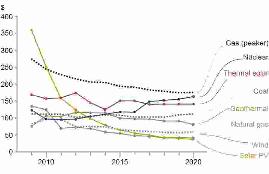 LCOE of energy from fossil and renewable sources