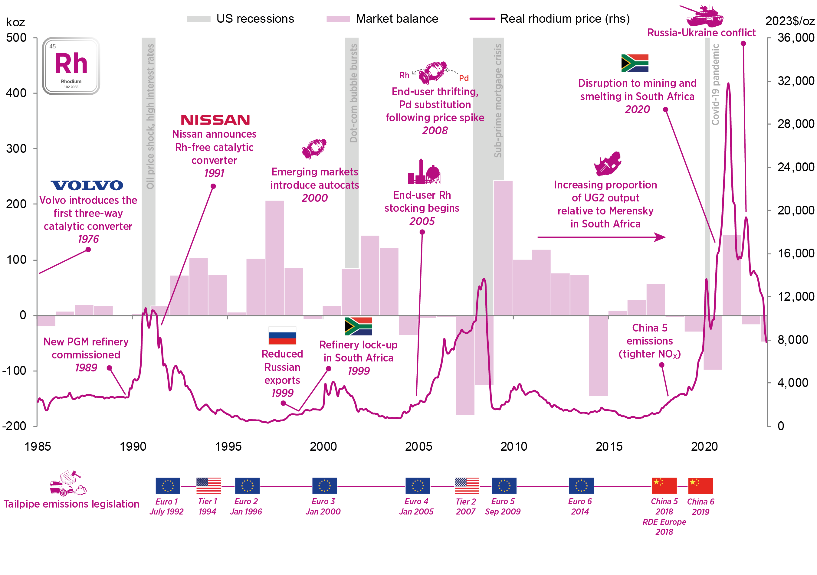 Rhodium price in context, 1985 to 2023